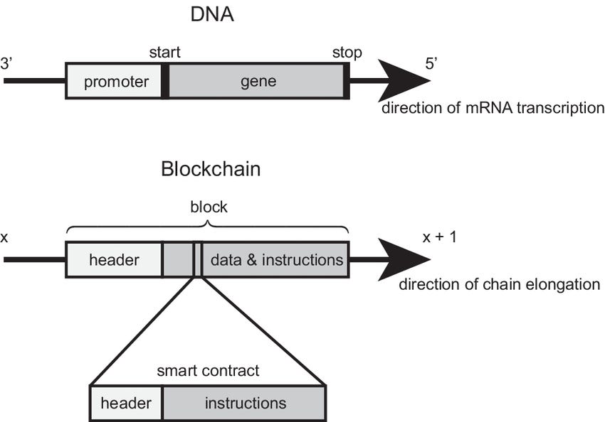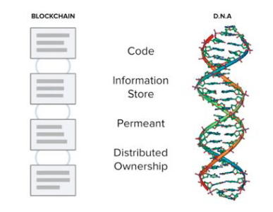 A side-by-side comparison of blockchain and a biological substrate dear to all of our hearts: DNA (Source: Abramov at al, 2021)