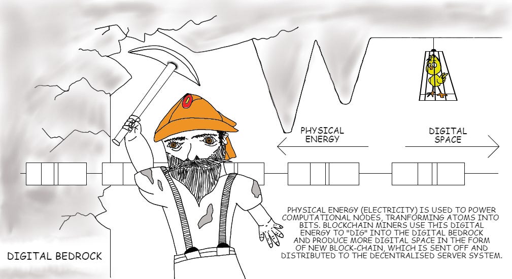 It would be fair to say that “blockchain” - often through the medium of “bitcoin” - has been in the zeitgeist for a good minute or two by now. Crypto-this, bit-doja-lite-coin that; what is it you are mining exactly? You have probably heard it all. I am not going to go into it because there is an abundance of information out there, almost as much as the people trying to make a fortune off “crypto, bro”. What we are interested in here is the underlying substance, or more in-keeping with the theme of this article: substrate. Cryptocurrency fever led to crypto-communities who based their existence around the abstract but very real process of blockchain “mining”. So, back to that question: Mining where?/what?/with who? *cough-cough* “I think I am getting the black lung, pop”. To thinking of the blockchain mining process, especially when it comes to the transformation of the atom to the bit vis-a-vis the physical to the digital, it may help to use the following visual: