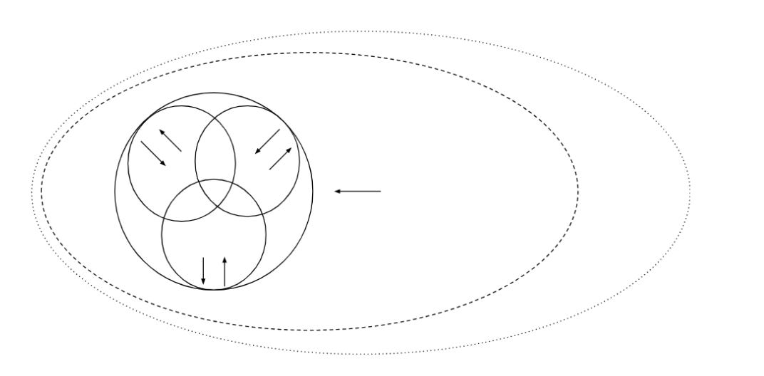 Another way of interpreting this set of nested circles is by noticing the interconnection of each individual triplet at the centre of this map. Just like how movement in one Borromean Ring affects the rest, each of these spaces act upon one another in a unique way. Interaction based on what object, mass, system, agent, organism that is generating movement within each space (e.g. the fault-based systems within the geosphere actualises its potential, causing an earthquake, in turn affecting living systems, masses, entities and agents inhabiting the biosphere). If you have ever read or watched “The Three Body Problem”, you might come to a quick realisation three intertwined spheres present a pretty tricky set of potential behaviours and influences, especially when these are anthrospheres.