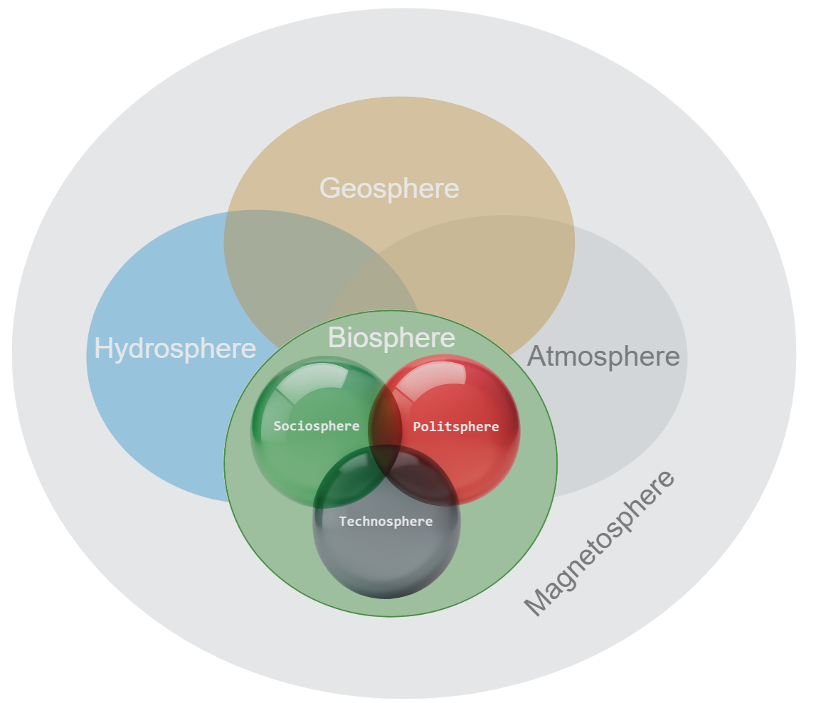 Visual aid for imagining the “anthrospheres”: the sociosphere, the politsphere, and the technosphere, all encapsulated within the biosphere, nested together with hydrosphere, geosphere, atmosphere and within larger planetary systems like the magnetosphere.