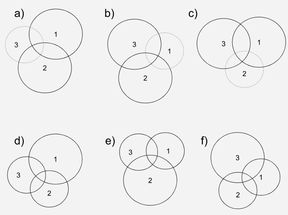 a) spheres 1 and sphere 2 extract from sphere 3; b) 2 + 3 > 1; c) 1 + 3 > 2; d) sphere 1 extracts from sphere 2 and sphere 3; e) 2 > 1, 3; f) 3 > 1, 2.